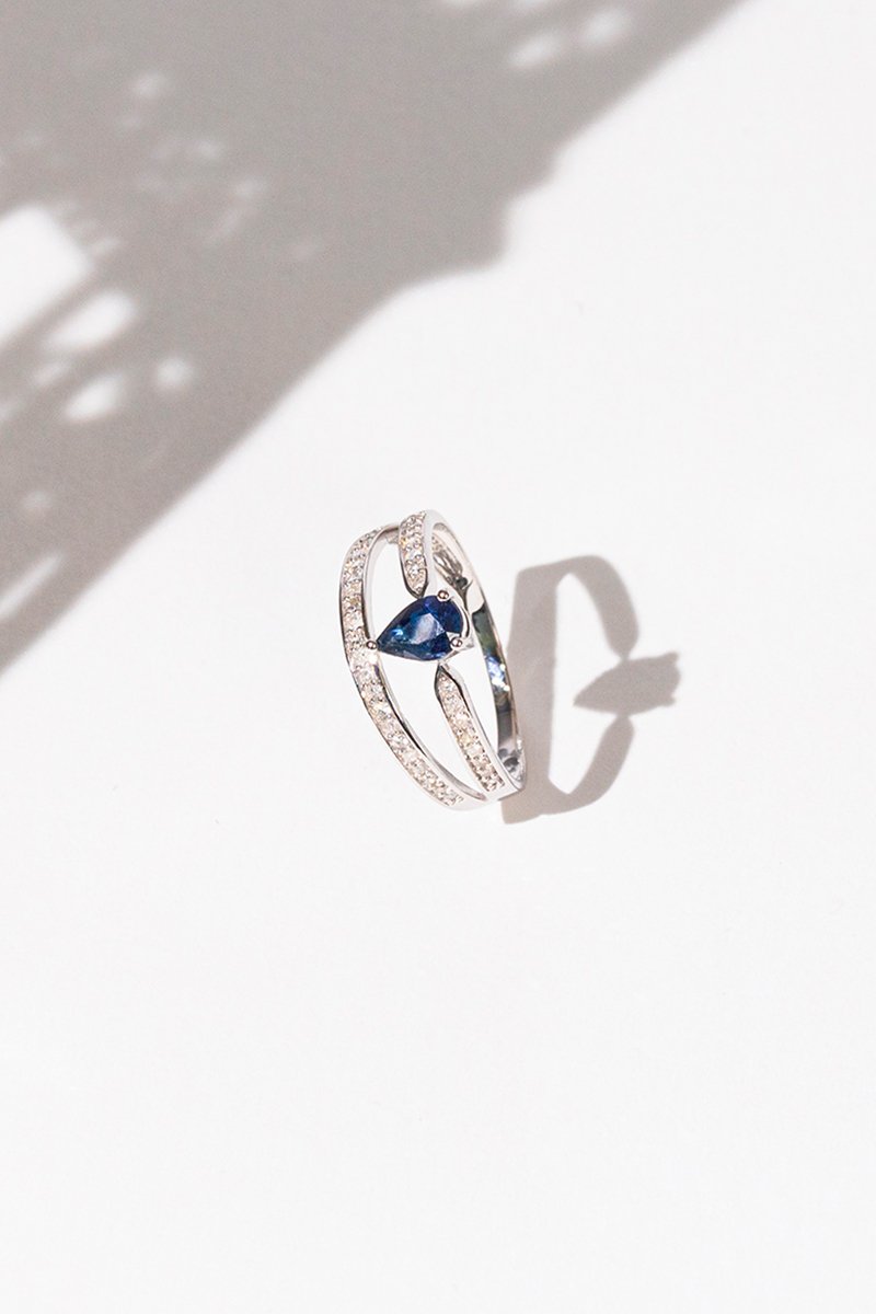 Anel de ouro branco incrustado com uma safira e 37 diamantes.