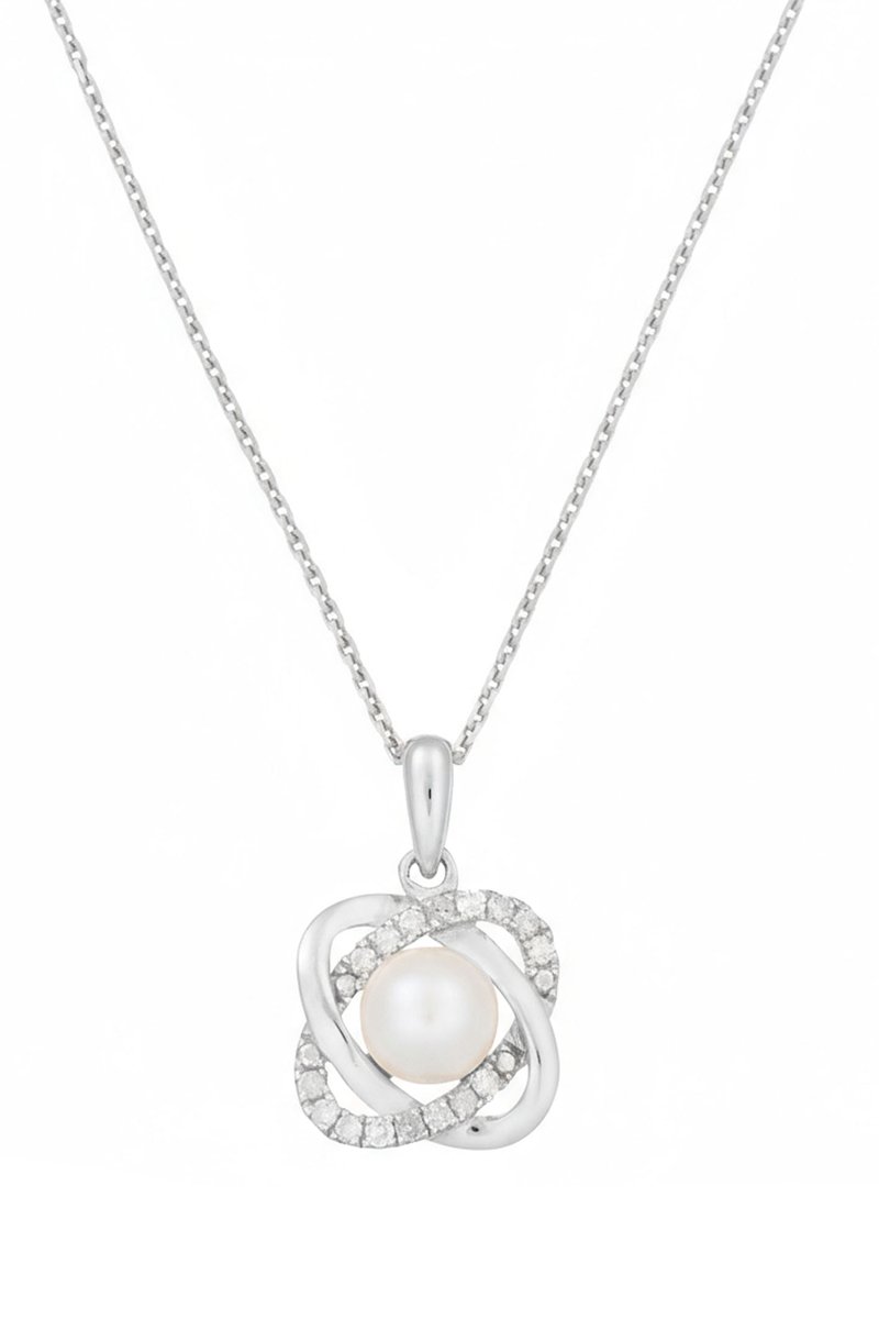 Pendente em ouro branco com 24 diamantes e uma pérola de imitação.