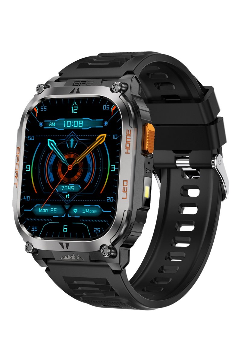 Alarme, bússola, cronómetro, temporizador, calculadora, lanterna e SOS.