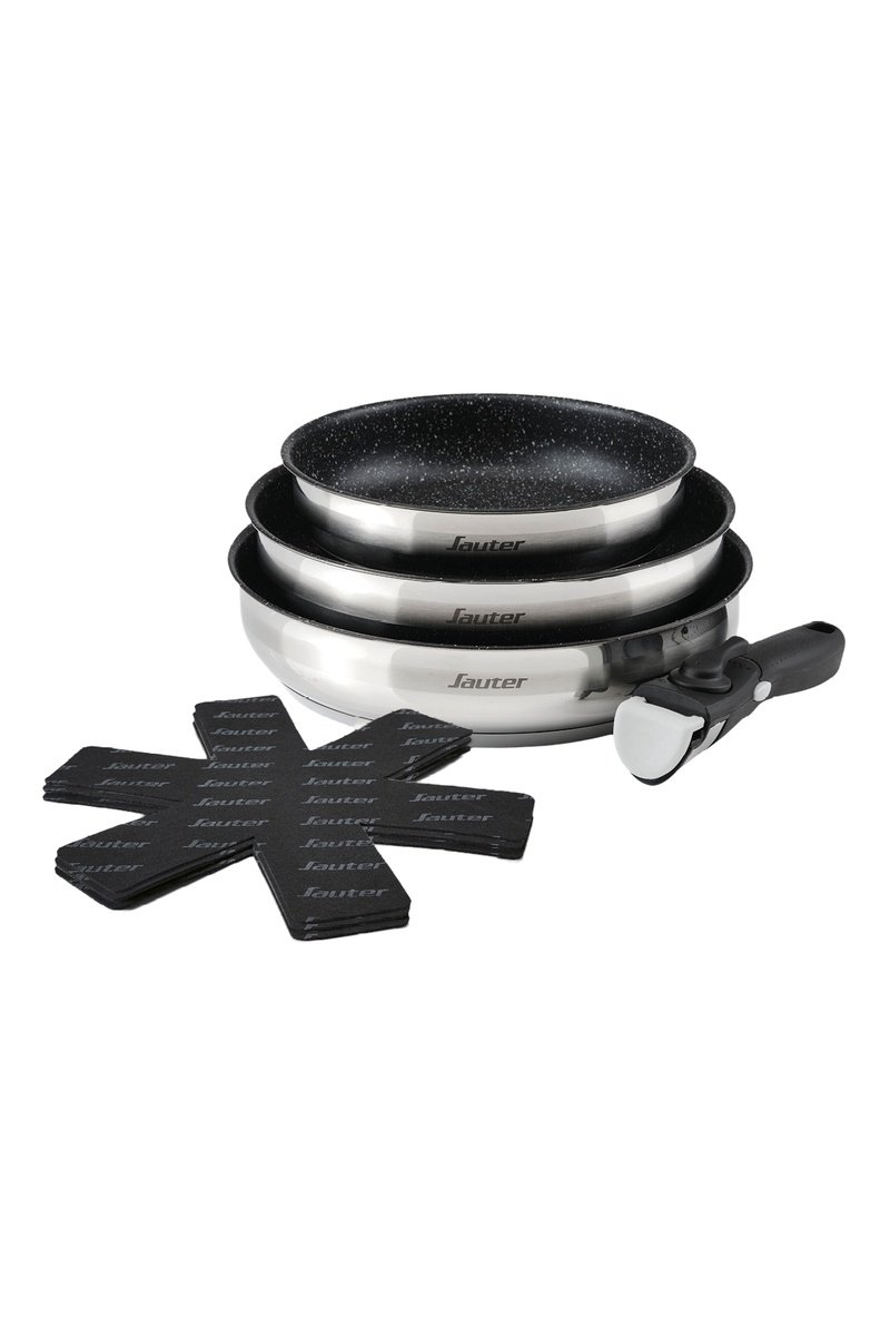 3 frigideiras em aço inoxidável revestimento cerâmica, 1 cabo amovível e 3 proteções de frigideira