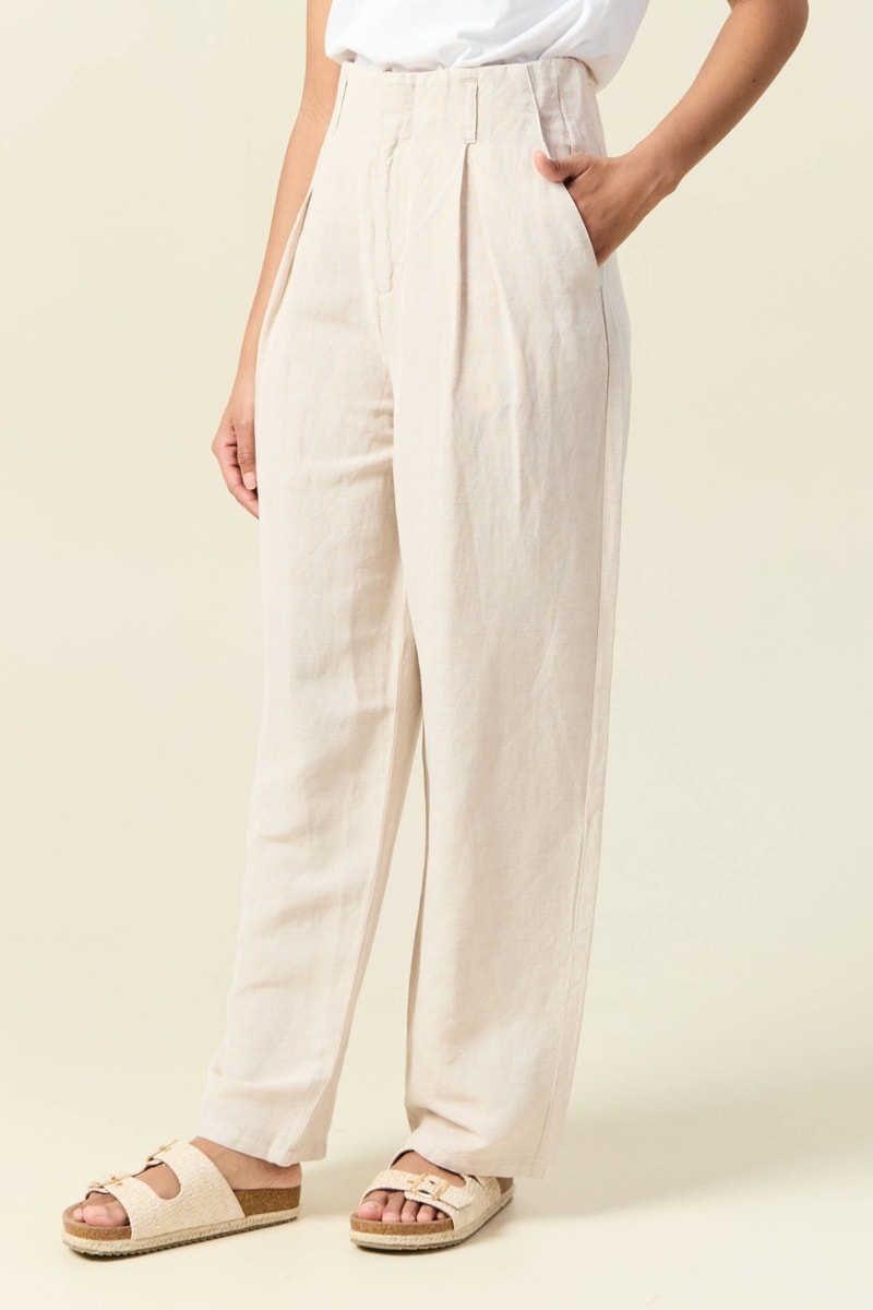 Calças largas de linho de cintura subida - Bege