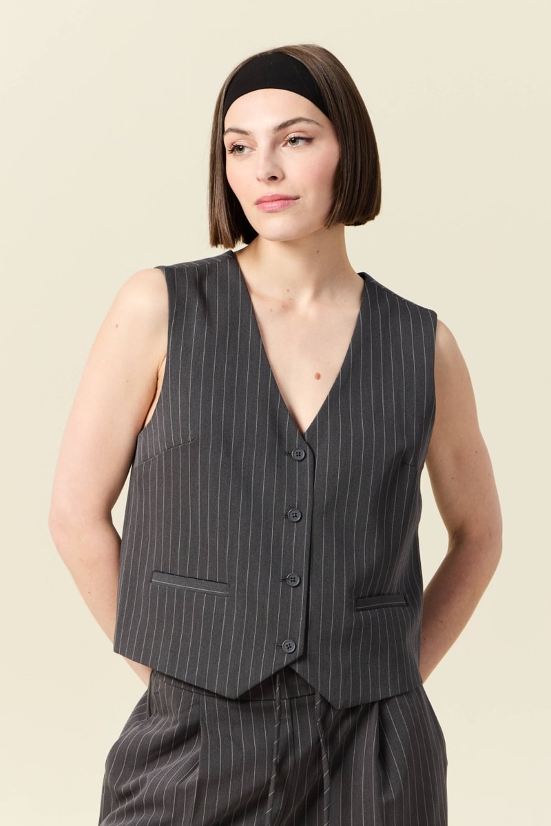Composição: 77% poliéster reciclado, 18% viscose e 5% elastano