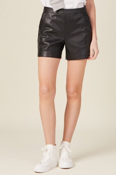 Calções direitos imitação de couro.