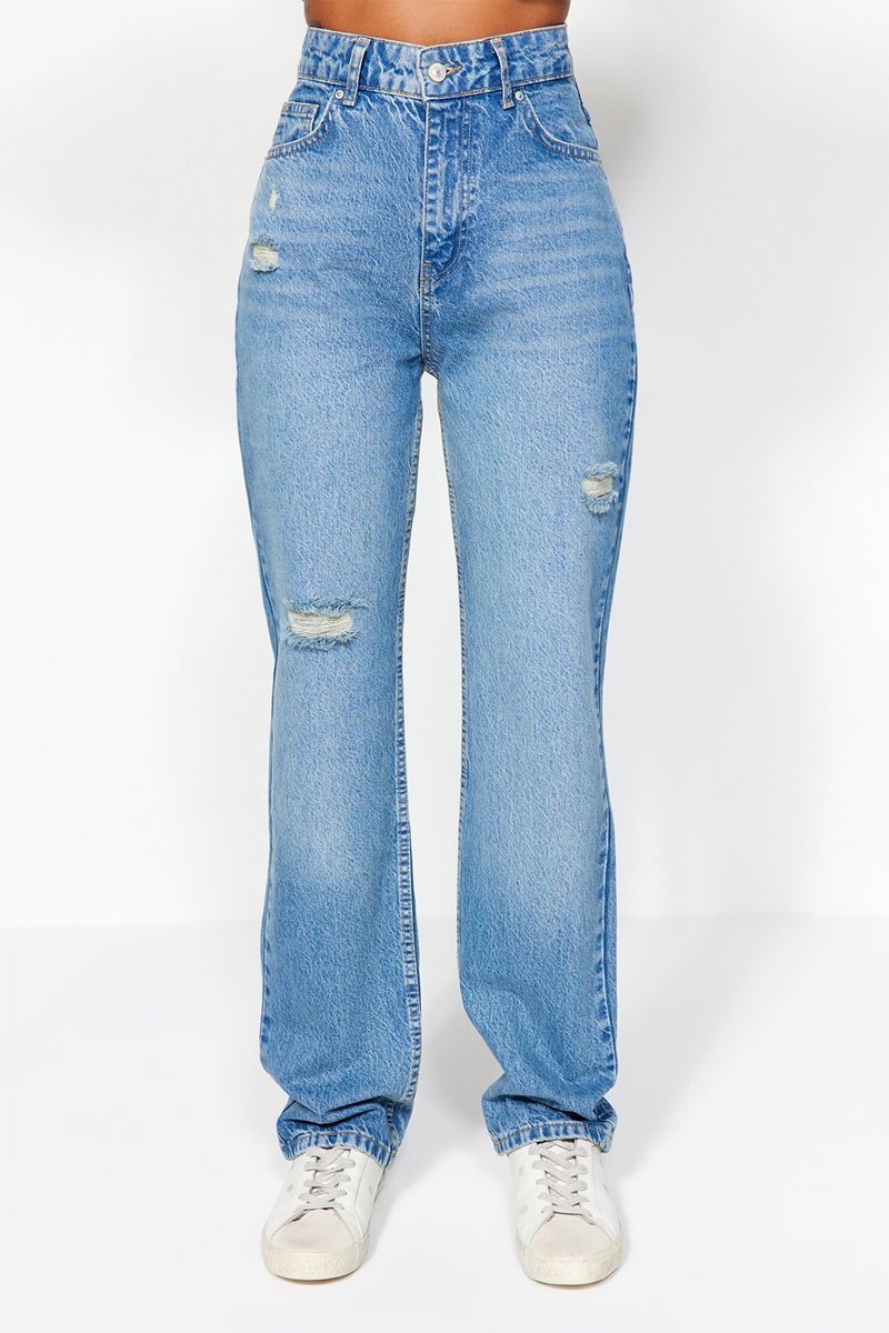 Calças de ganga wide legs cintura subida - Azul-celeste