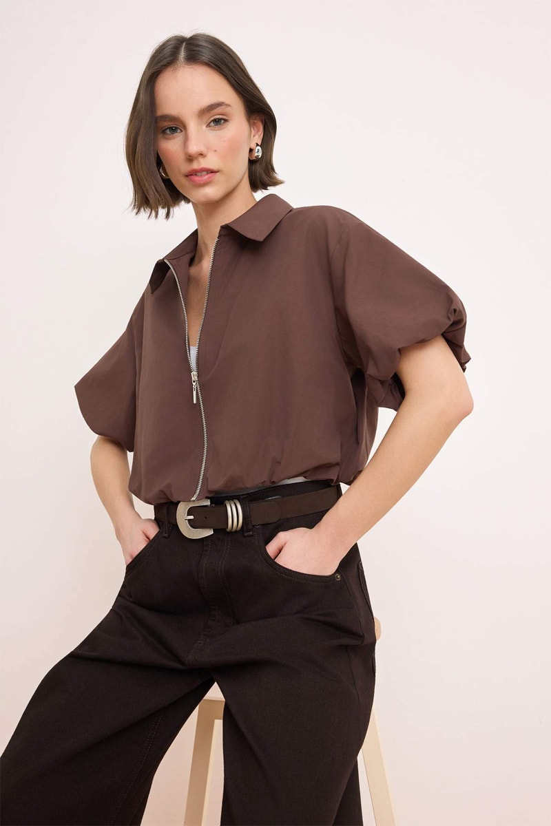 Casaco de mangas curtas balão elásticas.