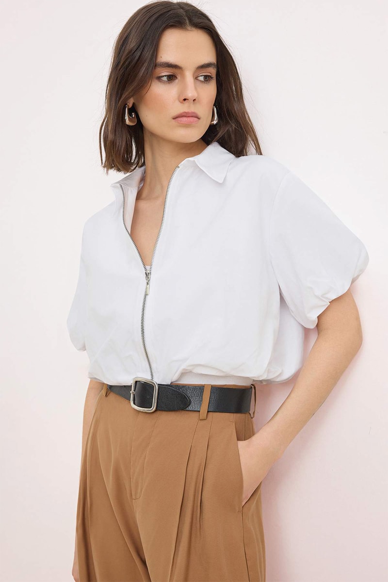 Casaco de mangas curtas balão elásticas.