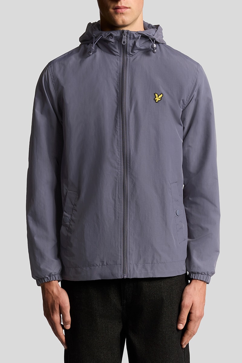 Corta-vento com capuz, atilhos de ajuste e travões de cordão.