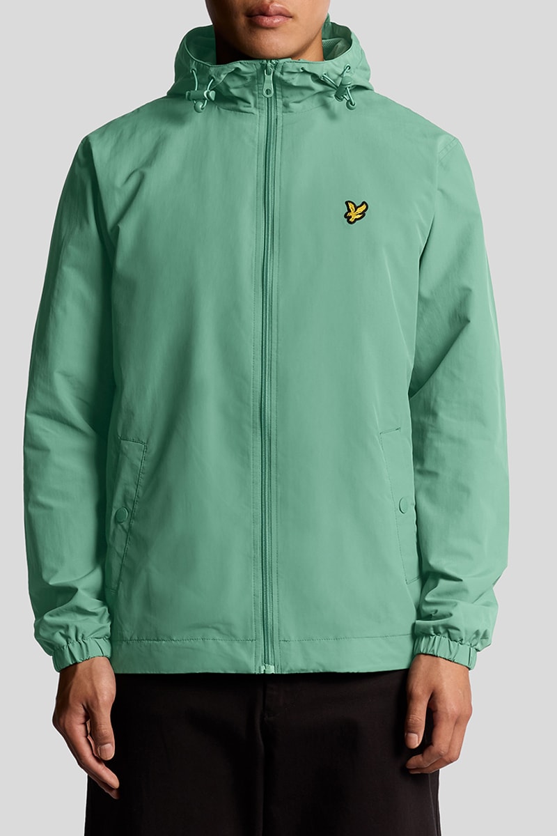 Corta-vento com capuz, atilhos de ajuste e travões de cordão.