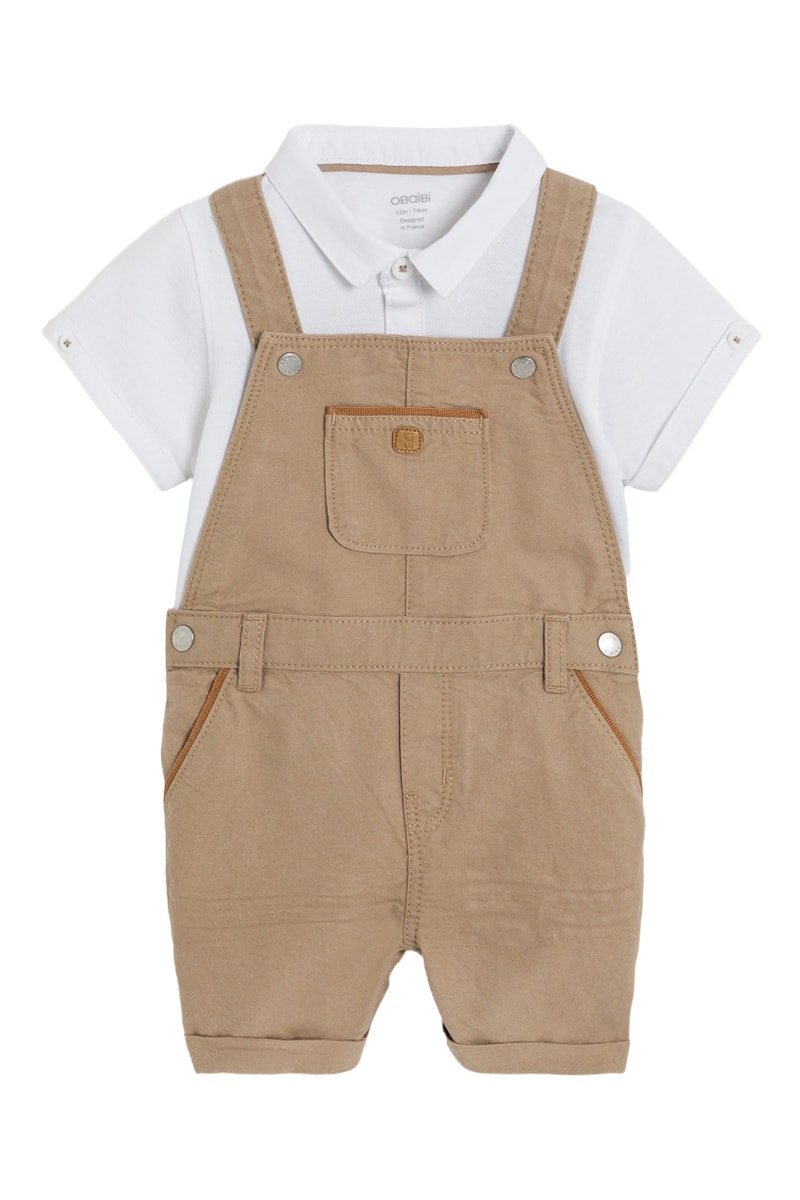 Jardineiras e polo - Bege e branco - Obaibi