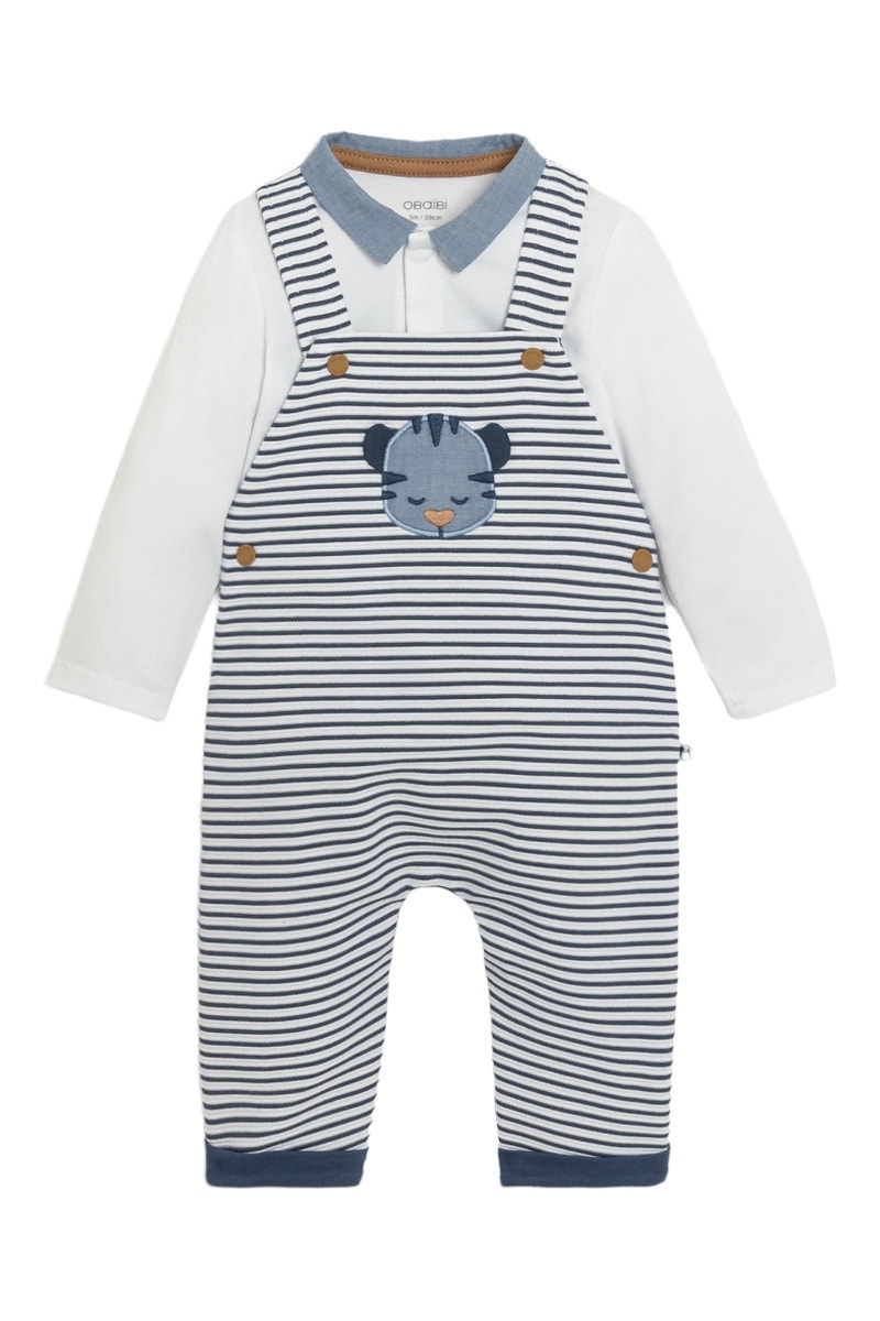 Jardineiras e body - Azul e branco - Obaibi