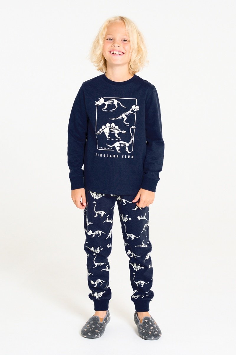 Inscrição e estampado dinossauros à frente.
