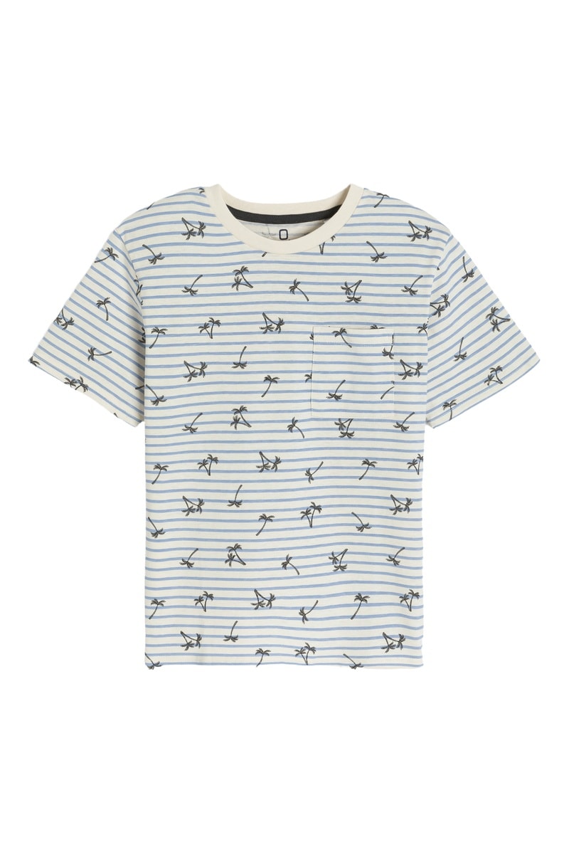 Estampado de palmeiras e riscas.