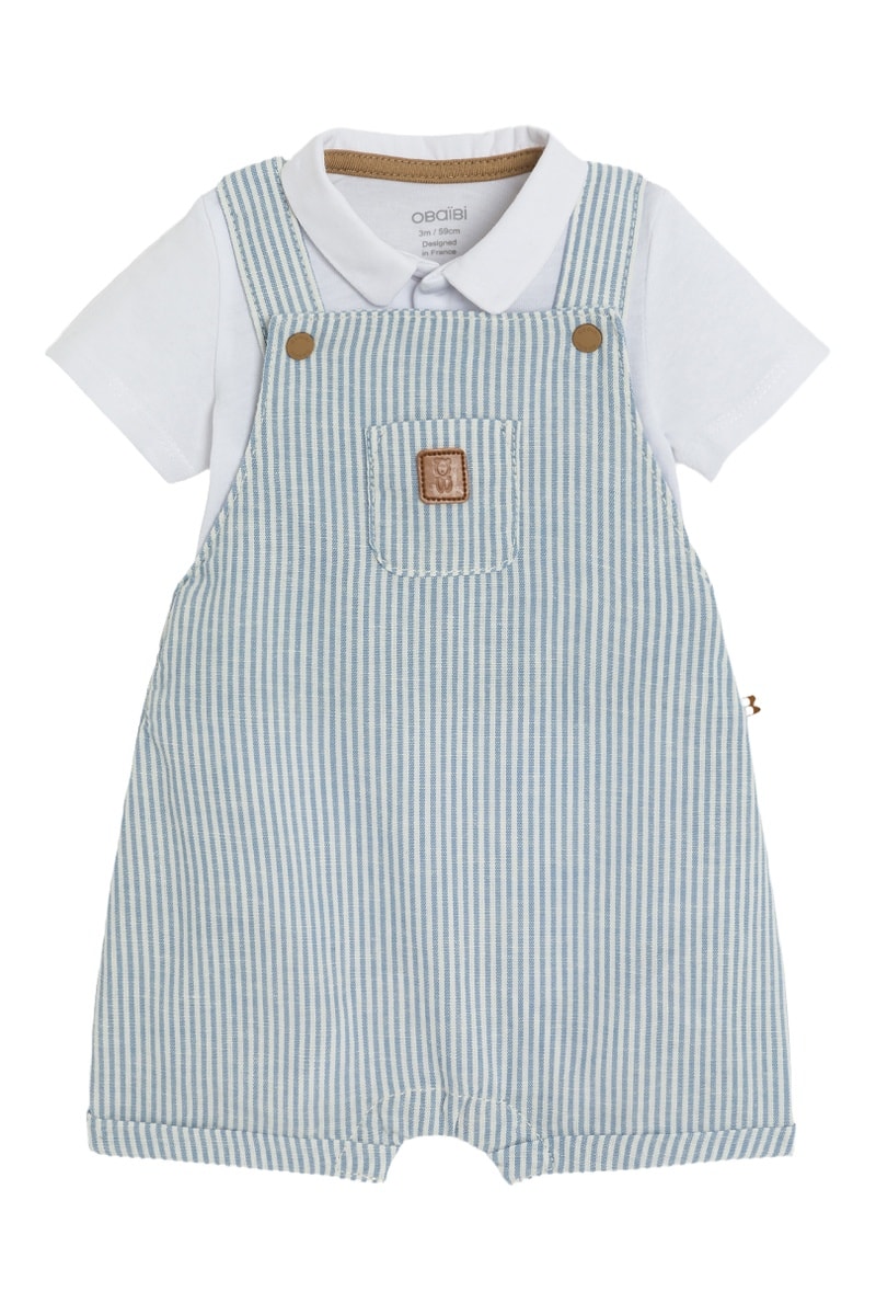 Jardineiras-calção e body - Azul-claro e branco - Obaibi
