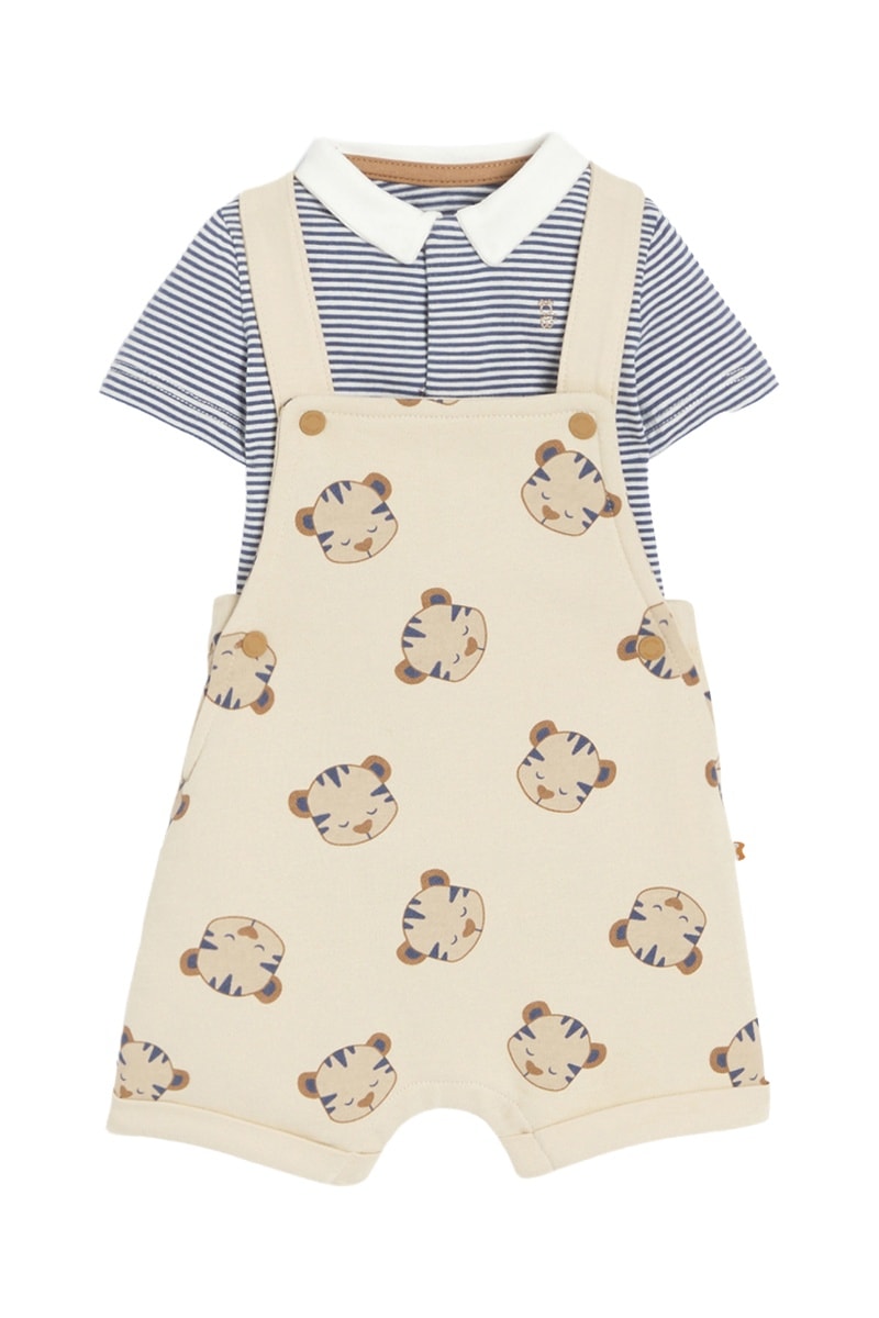 Jardineiras-calção e body - Bege e azul - Obaibi