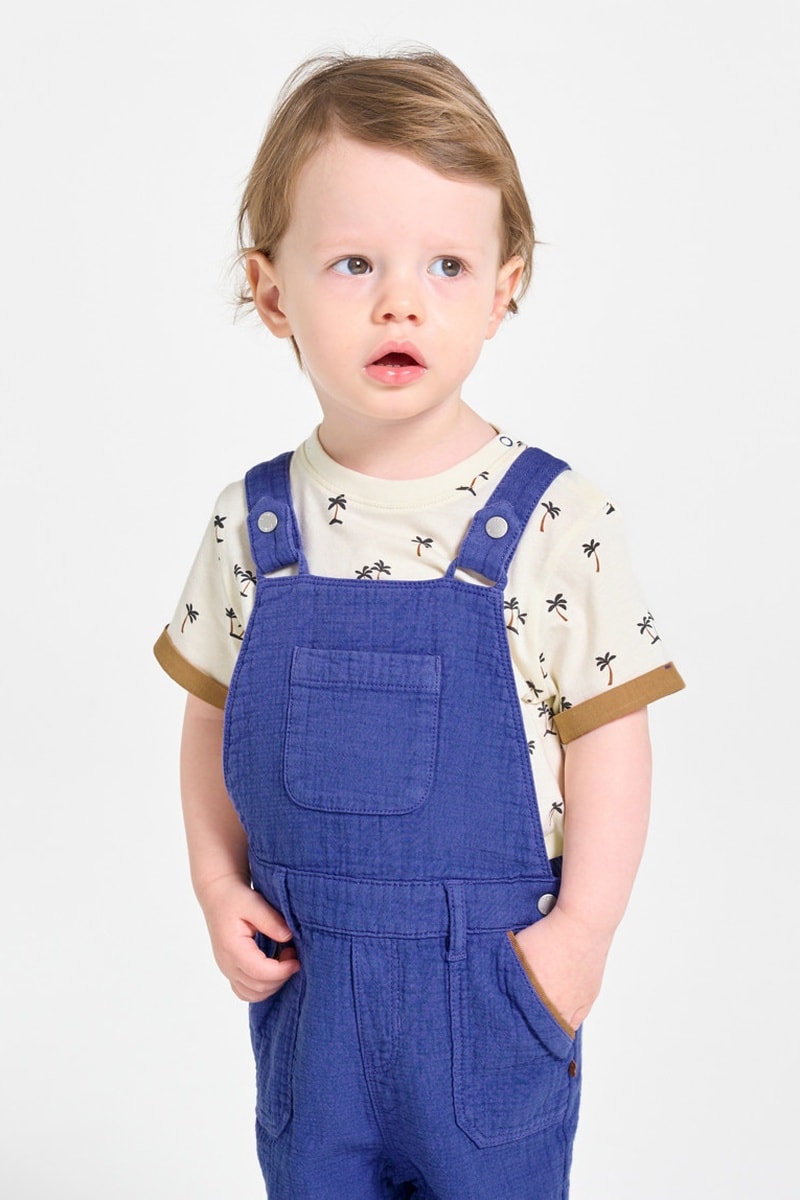 T-shirt e jardineiras-calção - Cru e azul - Obaibi