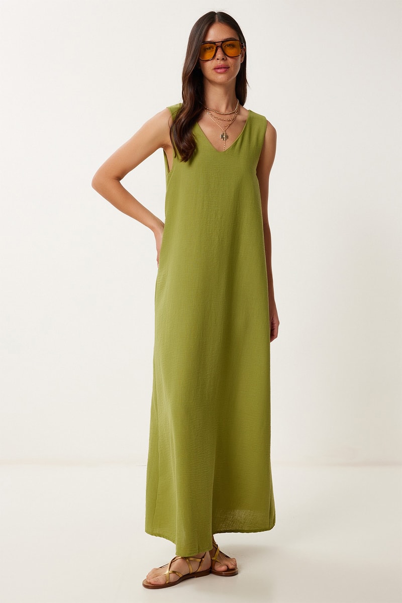 Vestido comprido em linho - Verde-azeitona