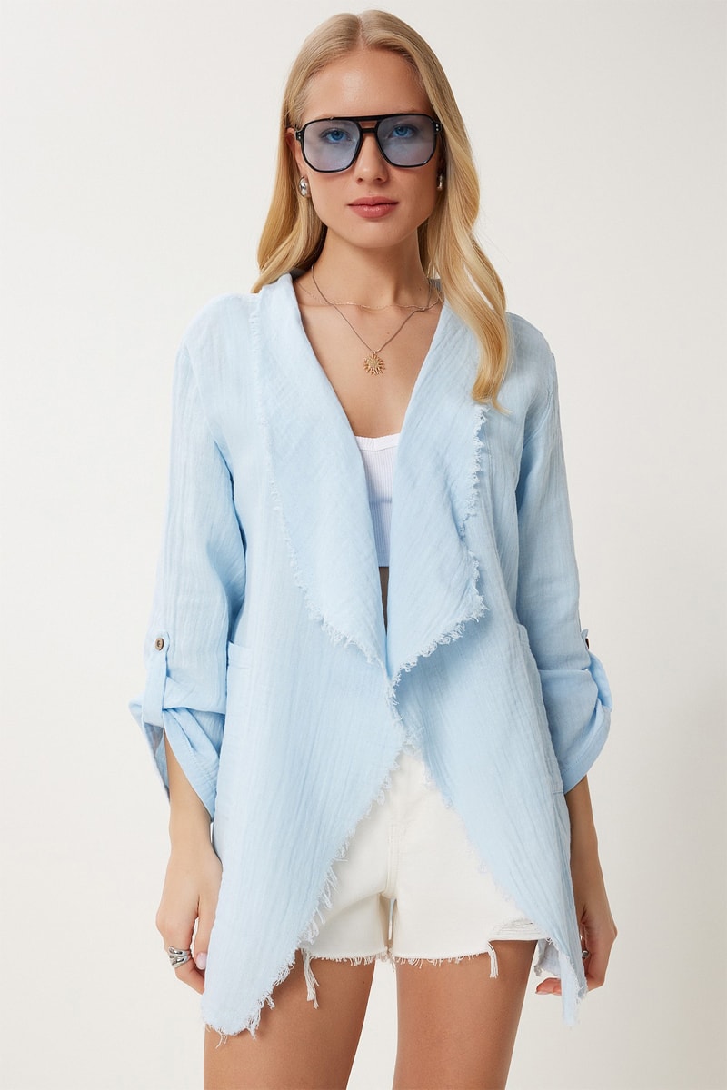Casaco de mangas curtas arregaçáveis com tira abotoável.