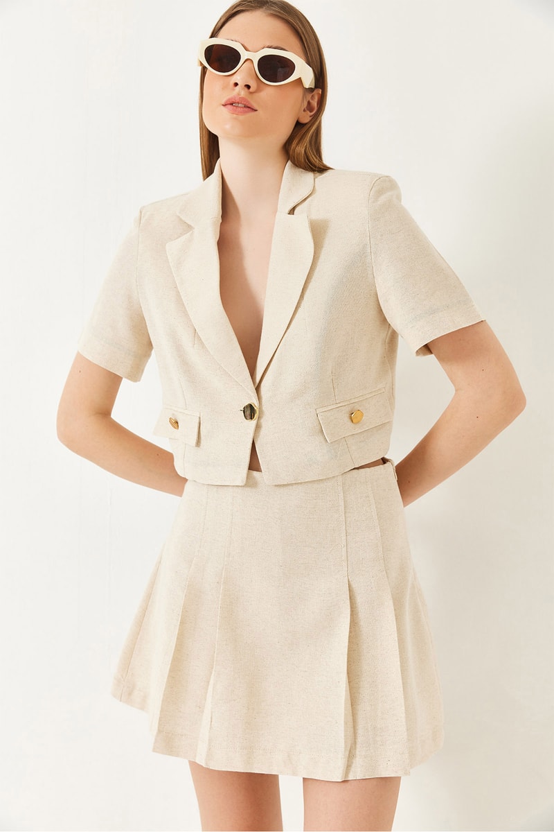 Casaco curto e minissaia plissada de cintura subida - Bege