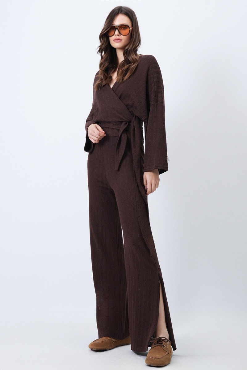 Crop top e calças de cintura subida - Castanho
