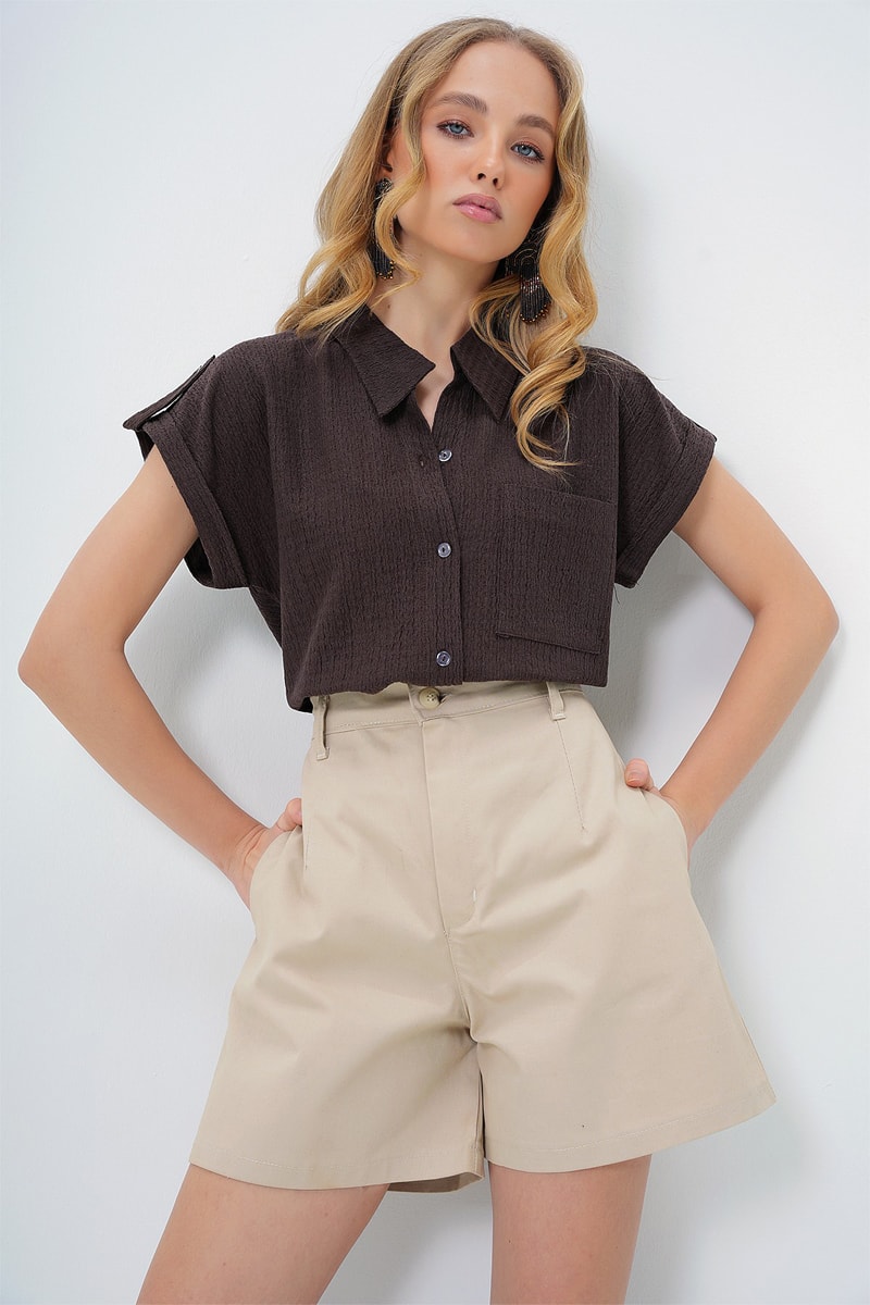 Camisa de mangas curtas arregaçáveis com tira abotoável.