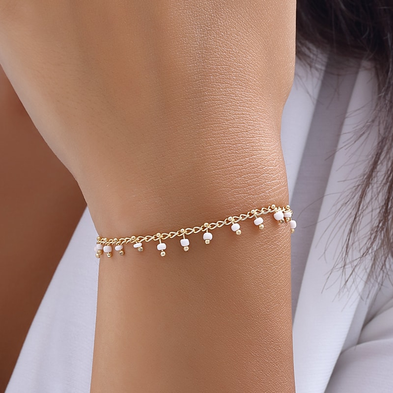 Deixe-se encantar por esta elegante pulseira de corrente em latão banhada a ouro, sublimada por pedras de cristal cuidadosamente dispostas. Um acessório elegante e intemporal, ideal para adicionar um brilho discreto ao seu look!