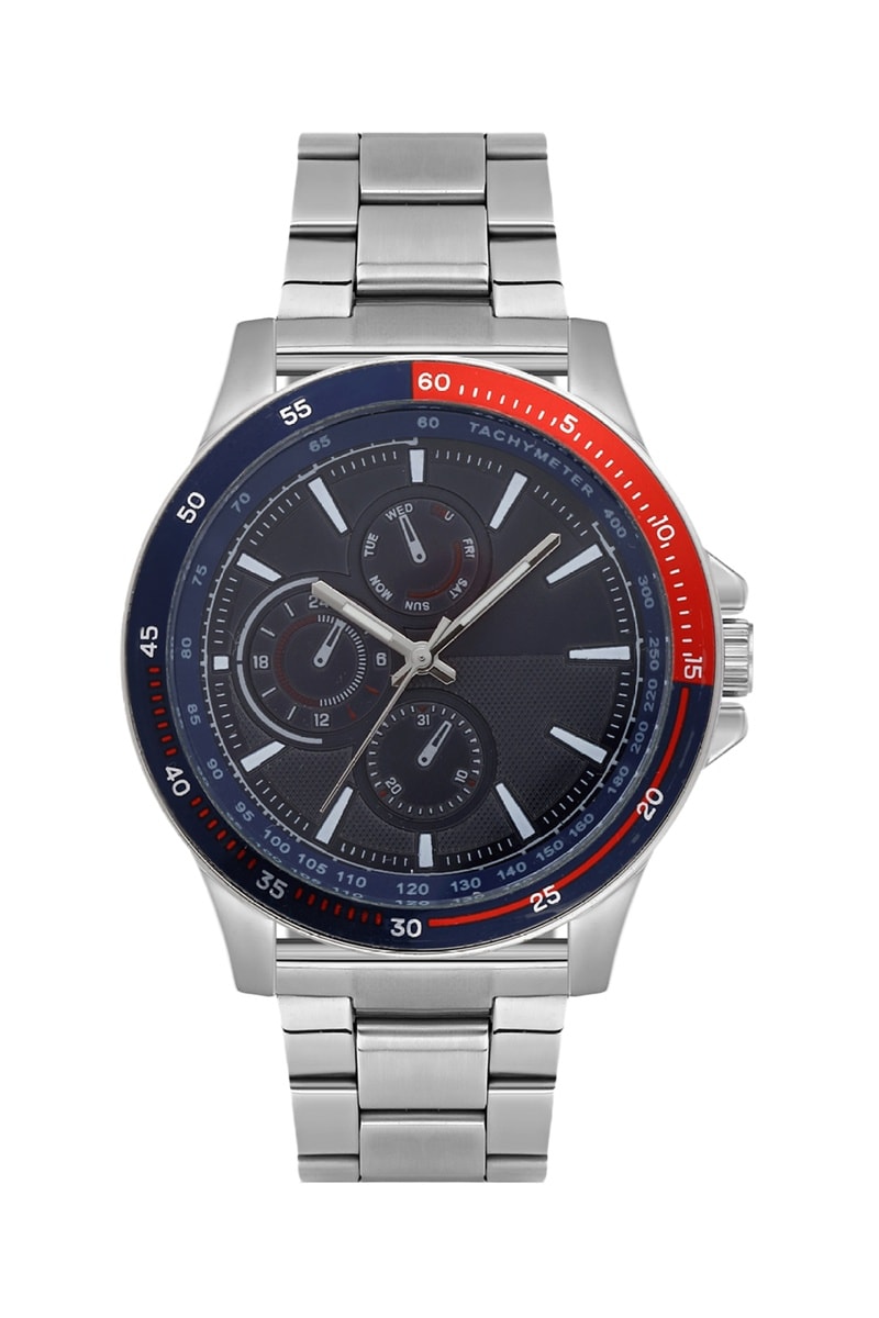 Relógio de quartzo em aço - Prateado, azul e vermelho - Taquímetro.