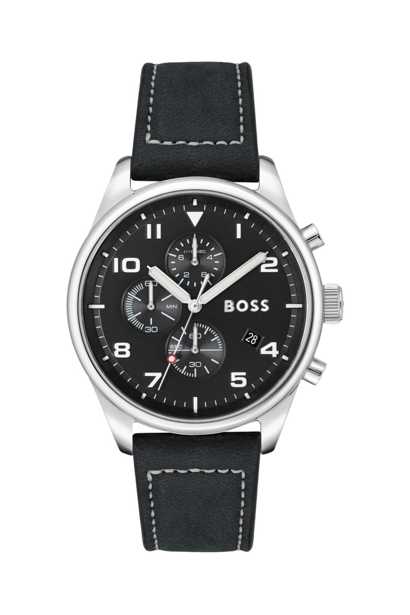 Relógio de quartzo em couro - Cronógrafo - Preto e prateado