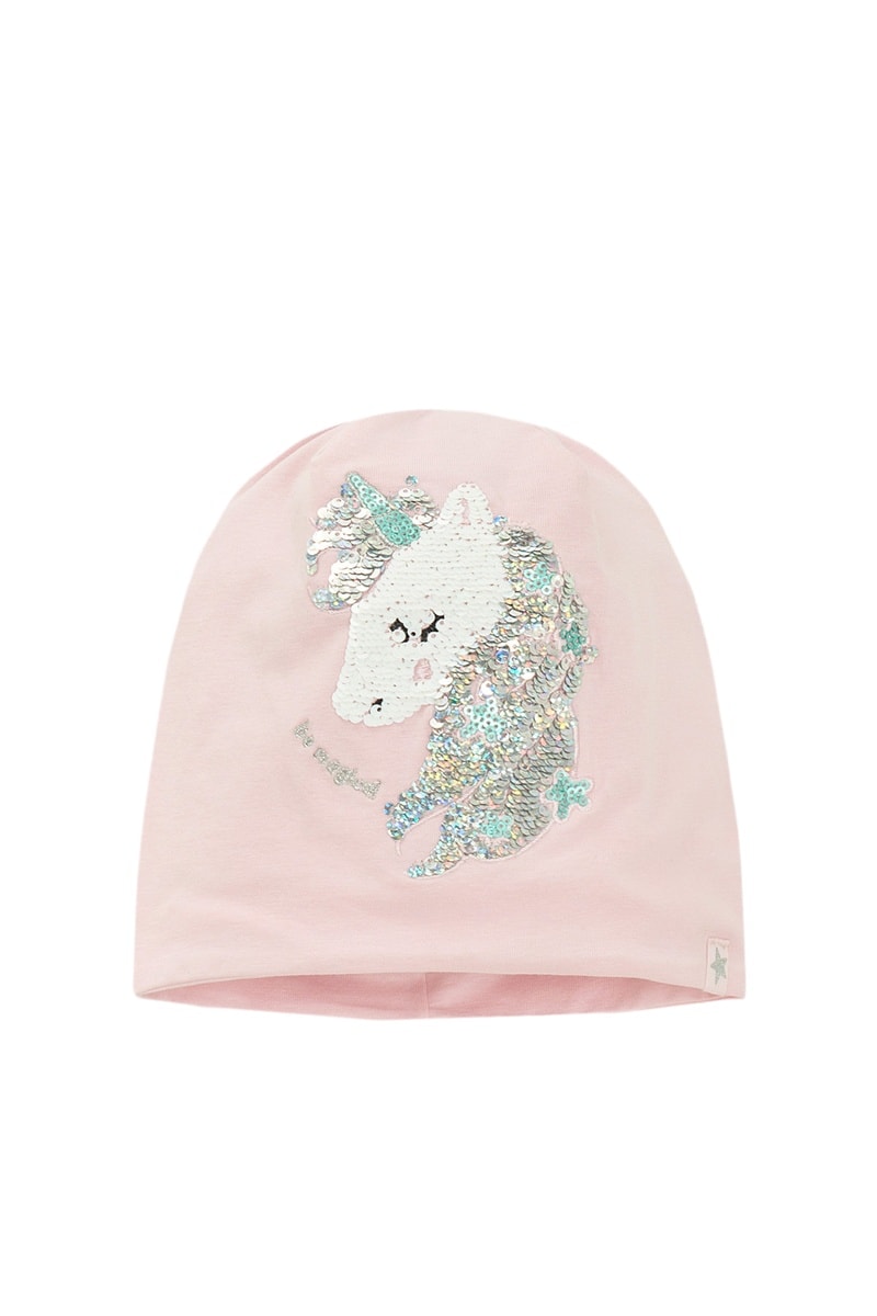 Inscrição bordado e padrão de unicórnio com lantejoulas à frente.