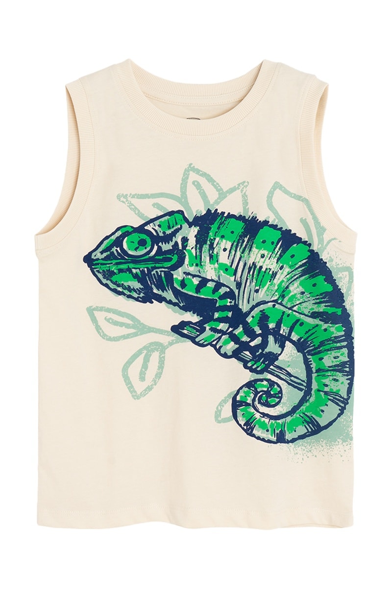 Estampado de camaleões e folhas à frente.