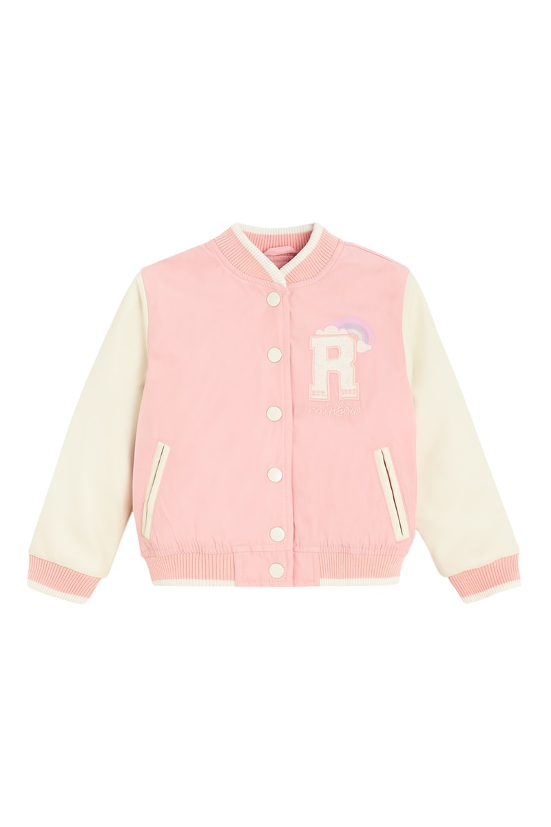 Números, inscrição bordada e estampado decorativo em relevo à frente.