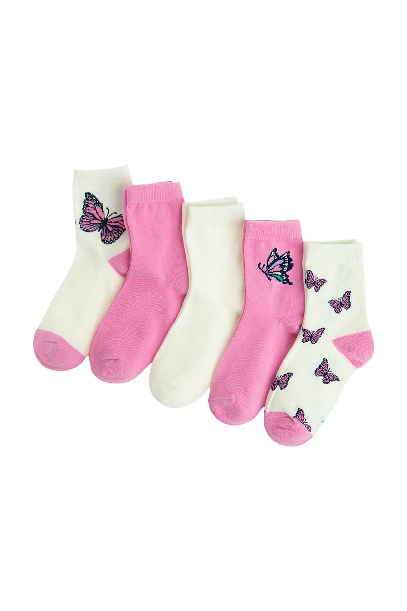 5 pares de meias dos quais 2 com padrão borboleta de lado e 1 com estampado de borboletas.