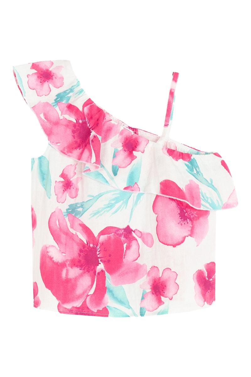 Gola assimétrica com folhos.