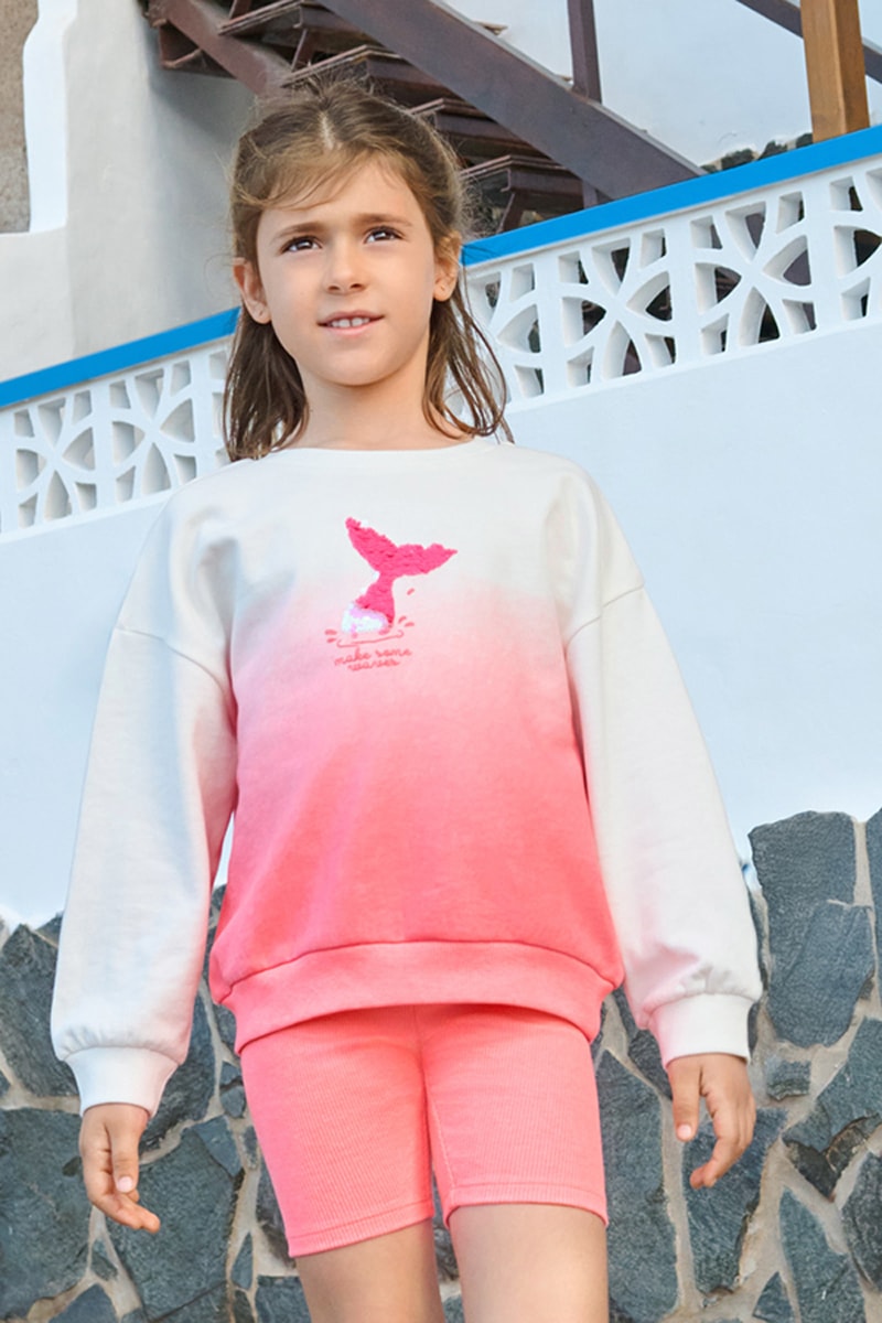 Inscrição bordada e lantejoulas reversível em forma de peixe à frente.