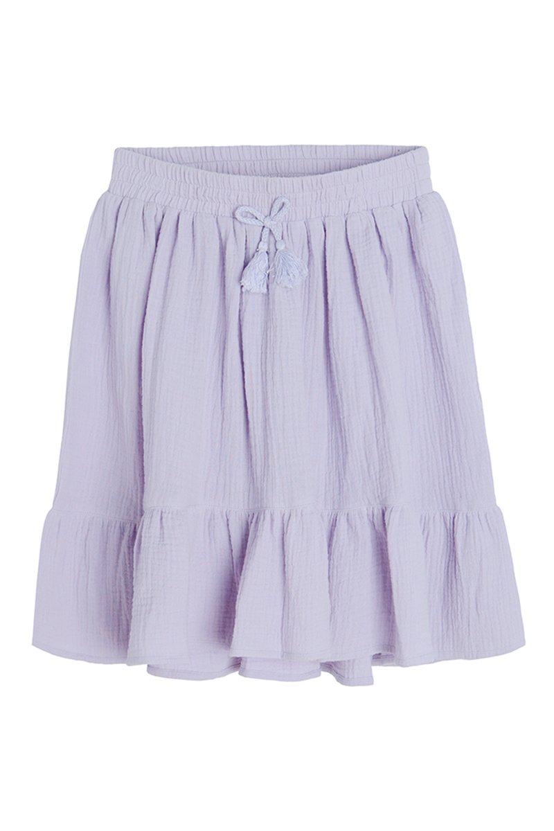 Cintura elástica com smocks e atilhos de ajuste com pompons.