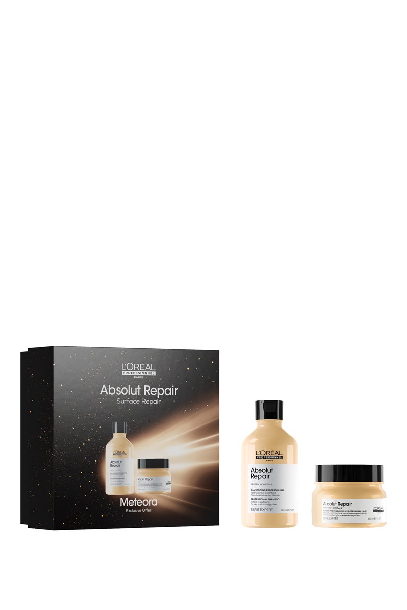 Coffret com um champõ reparador e uma máscara reparadora para cabelos estragados.