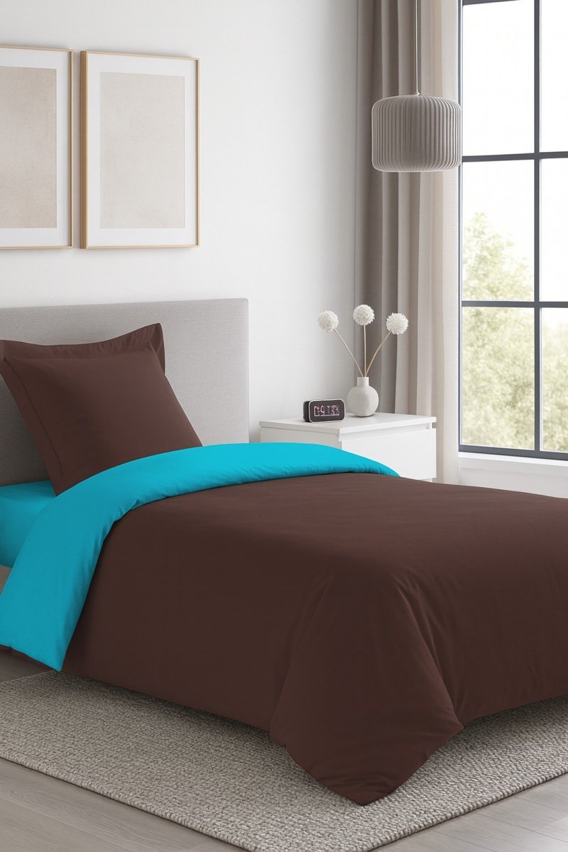Capa de edredão reversível em algodão - 57 fios/cm² - Chocolate e turquesa