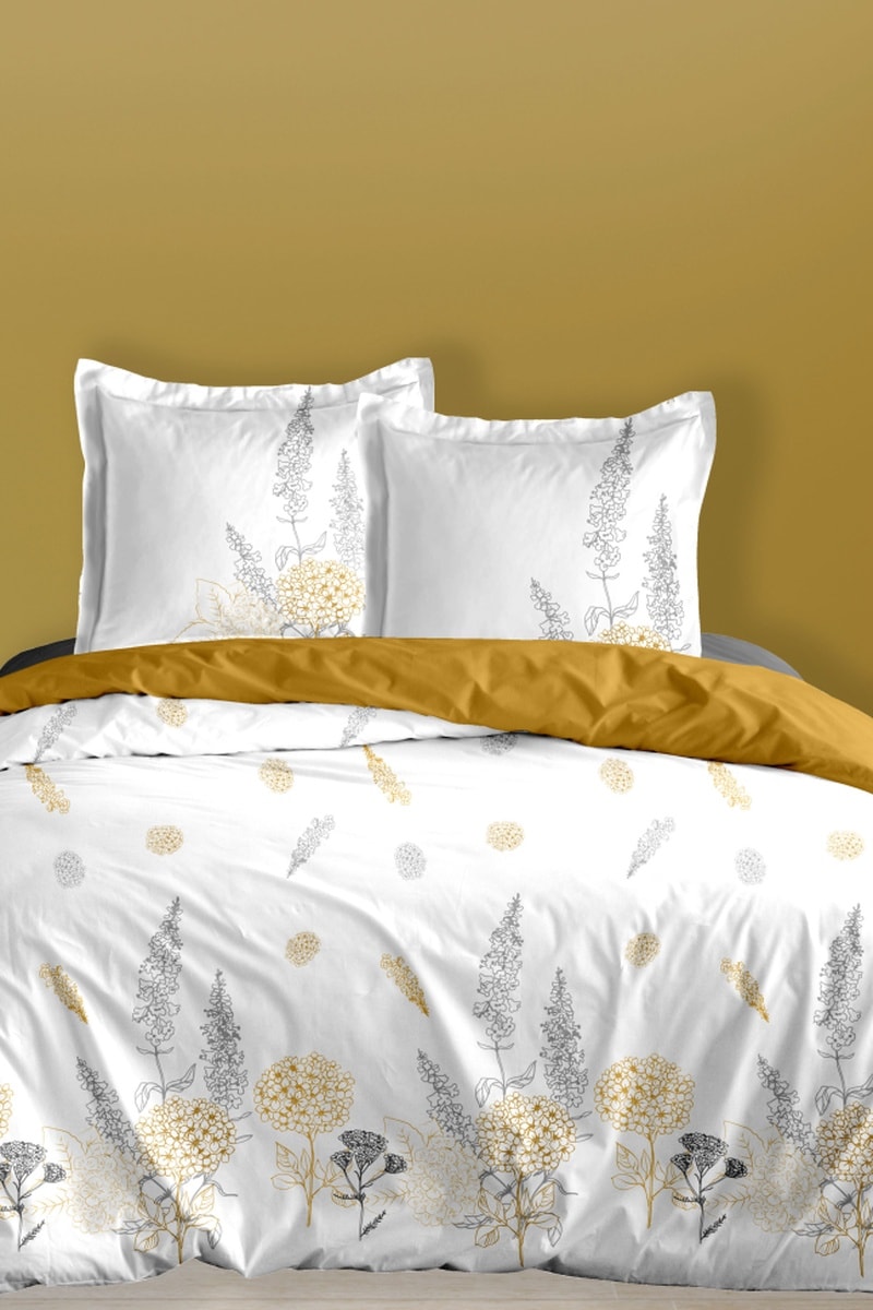 Conjunto de edredão em algodão 57 fios/cm² - Branco e mostarda