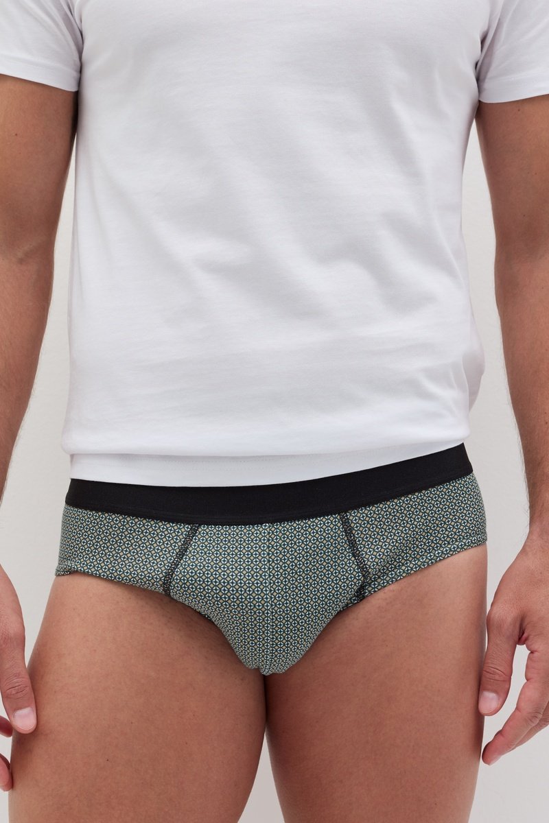 3 cuecas em algodão biológico 1 das misturado quais com estampado decorativo e 1 com estampado geométrico.