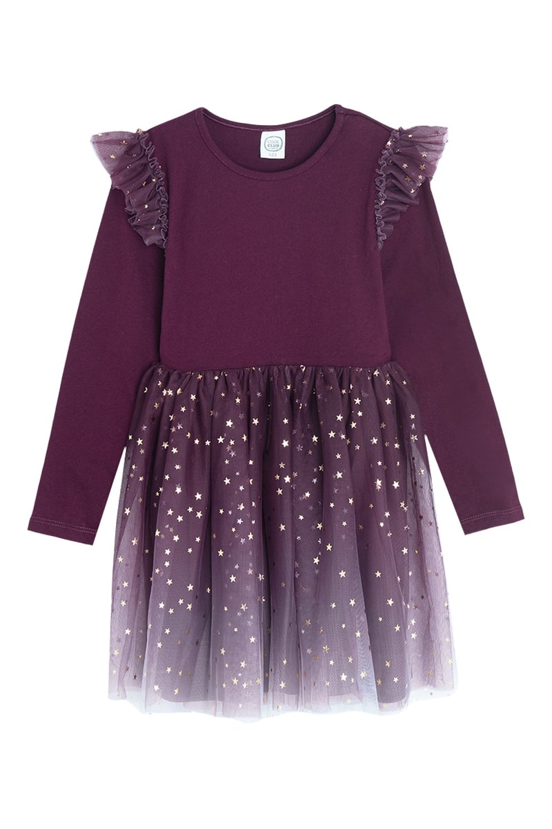 Folhos em tule com estampado de estrelas nos ombros.