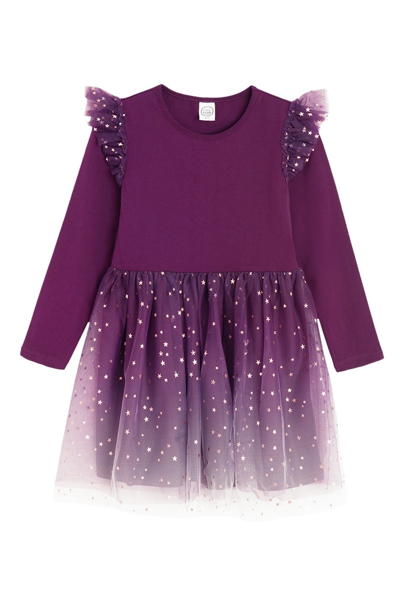 Vestido de manga comprida com folhos em tule com estampado de estrelas.