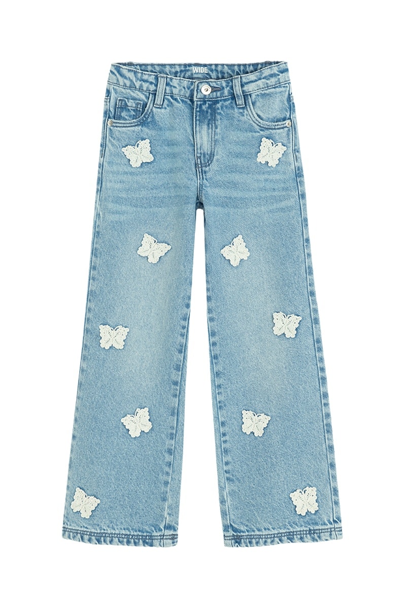 Aplicações em guipura em forma de borboleta à frente.