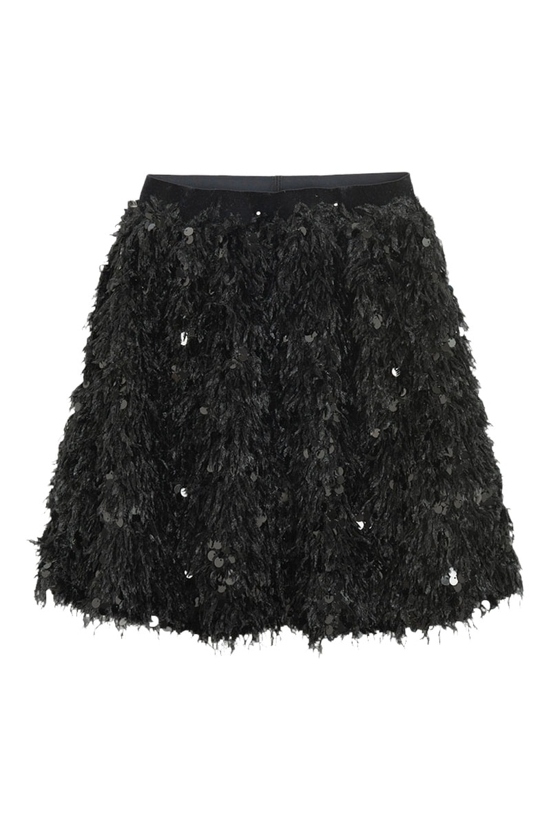 Saia com lantejoulas e penas.
