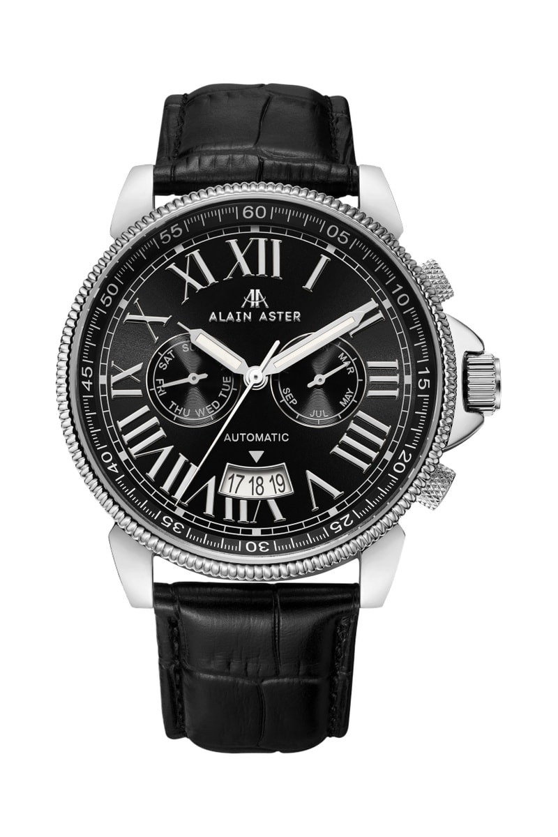Relógio automático de couro - Preto e prateado
