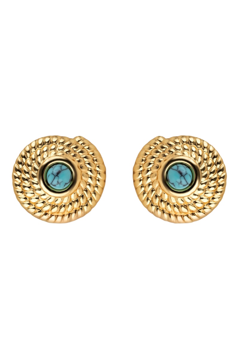 Brincos em aço inoxidável banhados a ouro amarelo com uma turquesa.