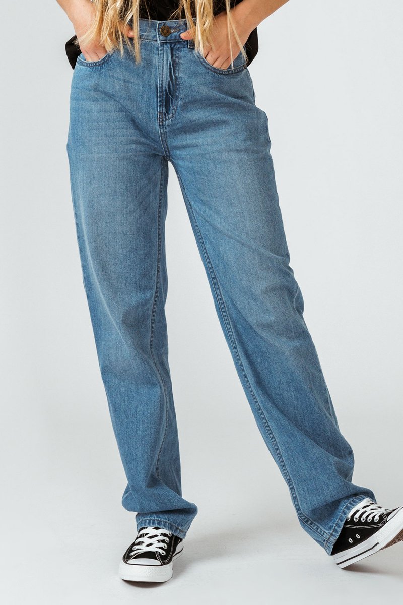 Calças de ganga direita em algodão biológico.