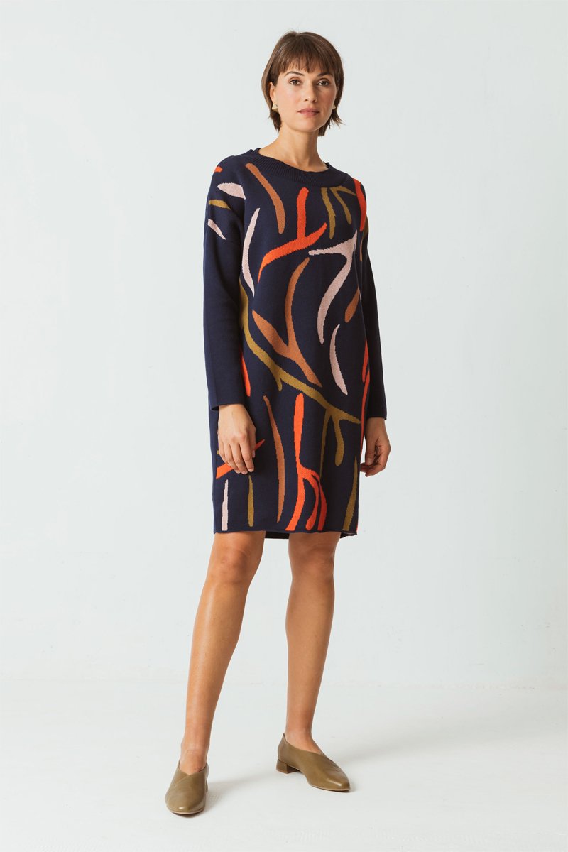 Vestido camisola em algodão biológico - Azul-marinho e laranja - Azul, verde, laranja e rosa