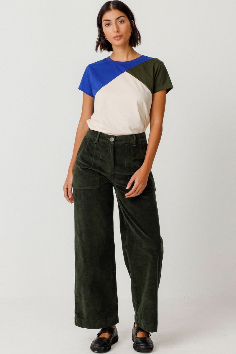 Calças direitas em veludo e em algodão biológico misturado.