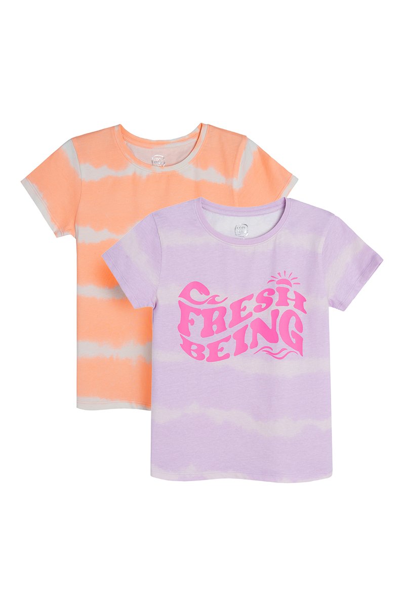 2 t-shirts tie and dye quais 1 com inscrição e estampado fantasia à frente.