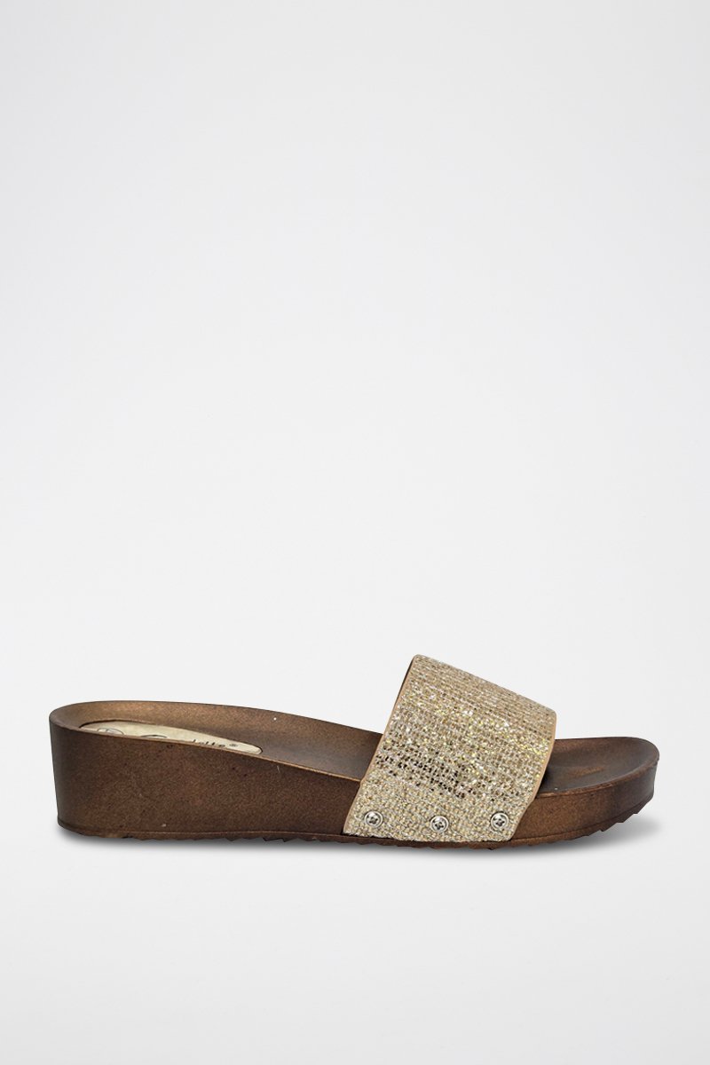 Mules com cunha e com purpurinas.