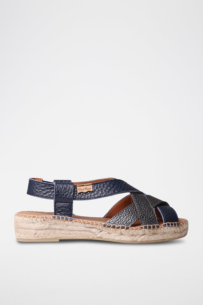 Sandálias com cunha em couro Elia-Bg - Camel e prateado - Preto e azul-marinho